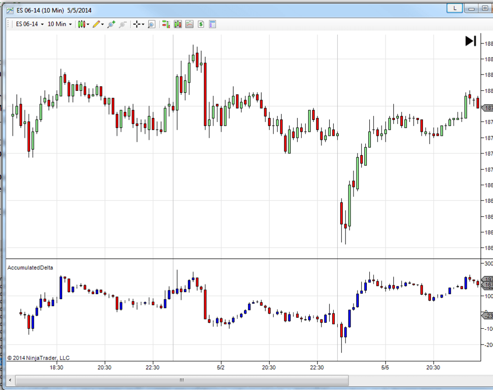 Delta describes the net difference between buying and selling entering the market. It is calculated by subtracting the volume transacted at the bid price from the volume transacted at the ask price. Trades at the ask price are initiated by aggressive buyers; trades at the bid price by aggressive sellers. A positive delta reflects more aggressive buying; a negative delta reflects more aggressive selling. The Delta Divergence Indicator shows the delta of each bar as a Histogram, and the Accumulated Delta shows the delta development over the session or between sessions.